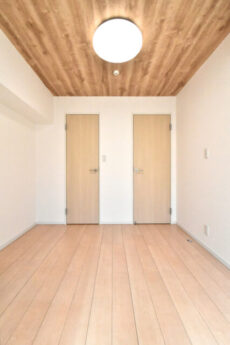 南西向きのサンルームに面した明るいお部屋です。扉はすりガラス、障子越しのような柔らかい光がいい感じですね。床はまた違うフローリングなんだと思っていたら、なんと今度は天井の方に木目を生かしたパネルが張られていました!!!