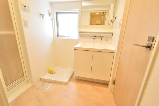 洗面室には洗面化粧台、洗濯機スペース、浴室、トイレがまとまっていて、脱衣所も兼ねています。間取り図にはありませんでしたが北西向きの窓が付いていました。開かなかったので外の様子はわかりませんでしたが、外光が入るのって気持ちいいですよね。