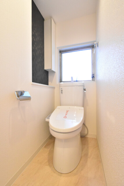 トイレはLIXIL製の洗浄機能付き。ちょっとしたものを飾れるニッチカウンターやトイレットペーパーのストックを入れるのに便利な吊戸棚も付いています。縦型は出し入れしやすくていいですよね。こちらにも間取り図にない窓付き!