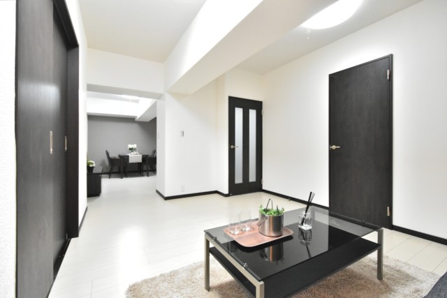 こちらはリビング・ダイニング・キッチン。縦長のお部屋は中央がくびれていて、奥のダイニングキッチン部分と手前のリビング部分に上手く使い分けられそうです。玄関ホールと同じモノトーンのモダンテイストで、置いてある家具がよく合っていますね。窓が無いのもあって夜の雰囲気です(^^)