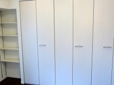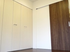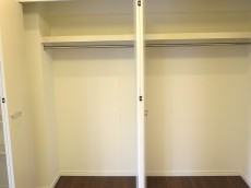 収納は壁一面を使った幅の広いクローゼット。衣装ケースなどを置けば畳んだ衣類を入れることも出来、更に収納力を上げることも可能です。扉は三枚に分かれていて、必要な所だけ開けることも全開にすることも出来ますよ。