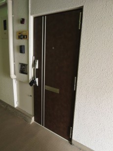 お部屋は9階。エレベーターの扉はピンクベージュです。玄関ドアは安心の