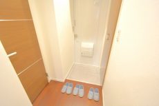 エレベーターで4階まで上がり、明るい外廊下を進むとお部屋に到着です。ここのマンションは内廊下のお部屋も多いのですが、今回は外廊下なんですね。左のテラスみたいな所は危ないので出ないように!とのことですので気を付けましょう。