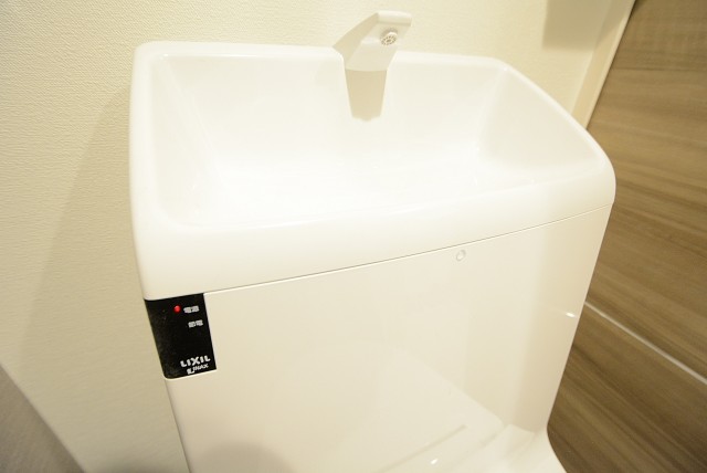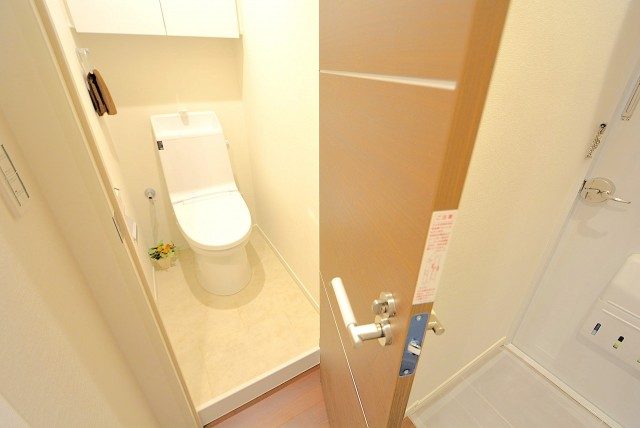 INAX製のシャワートイレ付。トイレットペーパーなどのストックに便利な吊戸棚も付いています。