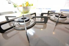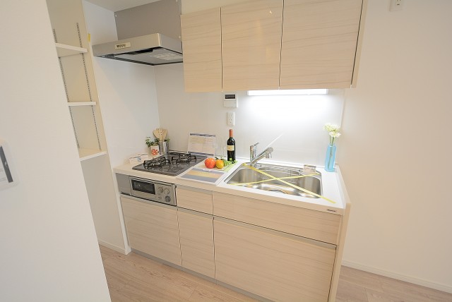 コンロは3口、グリルも付いて調理器具は充実。グリルって魚のイメージが強いですが、他の食材にもいろいろと使えるんですよ。ただし、使う時は換気扇をお忘れなく!早めに回すのが効果的らしいですよ。