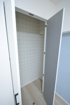 洗面室には洗面台の他に、浴室、洗濯機スペース、トイレがまとまっていて、脱衣所も兼ねているようです。洗濯機スペースには棚が付いていますので、洗剤などはこちらへどうぞ。
