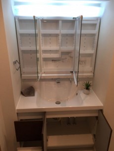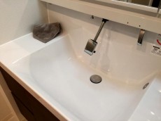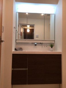 まずは、左手手前の洗面台。ブラウンの木調キャビネットと清潔感のある真っ白な洗面ボウルの洗面台です。