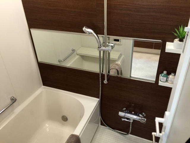 バスルームは、落ち着いた配色でリラックスできる空間です。洗面台の木調と同じトーンです。バスタブも大きめサイズです。追炊き機能付きなので、いつでも温かい湯船に浸かれるのは嬉しいですね。