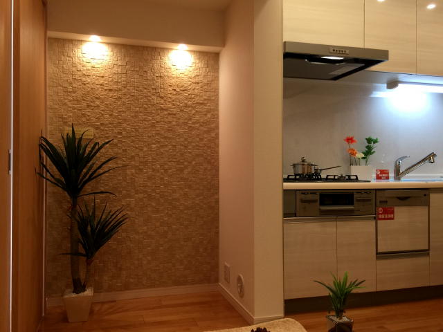 キッチン横の壁はエコカラットで装飾されています♫エコカラットは、見た目が洗練されているだけでなく、ホルムアルデヒトを吸着してくれたり生活臭を軽減したり、調湿機能があったりと、ものすごい実力を持っています。ダウンライトも素敵です。