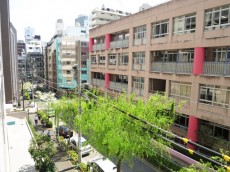 されています。目の前には新宿区立花園小学校と、通りに植えられた豊かな緑