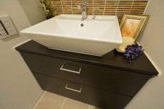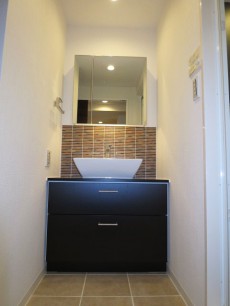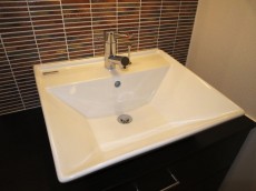 素敵な洗面室。スクエアな洗面ボウルが目をひきます。
