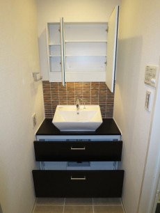ミラーの裏側はキャビネット収納、+下部もがっつりと引き出し収納なので、洗面台
