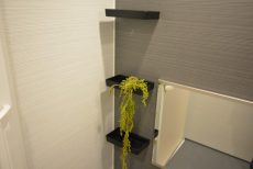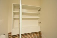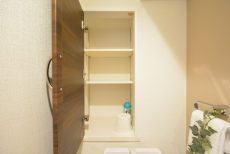 お手洗い奥には扉付きの三段収納があります!可動式なので自由に高さ調節が可能です(^o^)