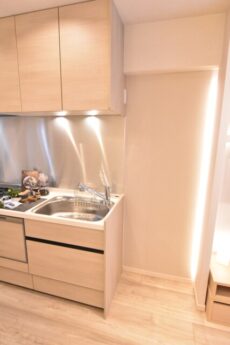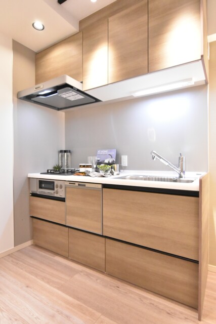 調理台は建具とお揃いの白木調パネルを使用。キッチン感の出やすい壁付けタイプながら、お部屋との一体感は抜群です。