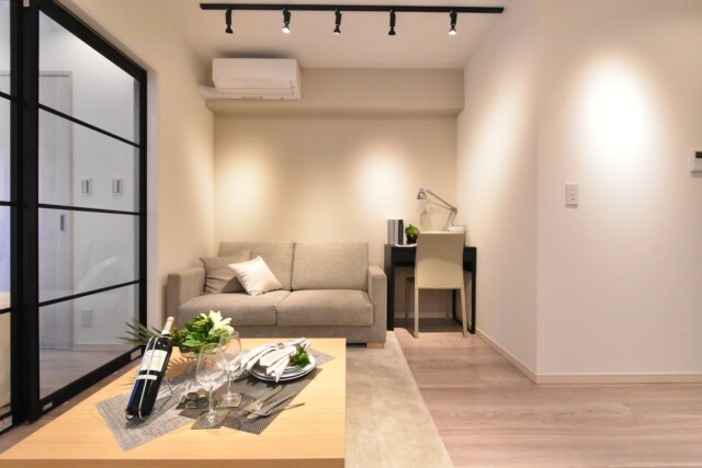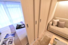 奥のベッドルームとダイニングキッチンとの仕切りとなる引き戸は、壁の中に完全に引き込めるようになっています。しかもガラス調なので圧迫感がありません。