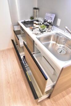 収納は吊戸棚と調理台下のスライドキャビネット。出し入れに少々難がある吊戸棚に対して、スライドキャビネットは開口部が広く出し入れが簡単なのが特徴です。ぎっしり詰めてしまっても、中が確認しやすいのも嬉しいですね。