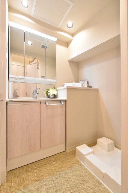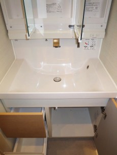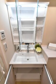 洗面化粧台は三面鏡付。三面鏡裏は全て収納になっています。