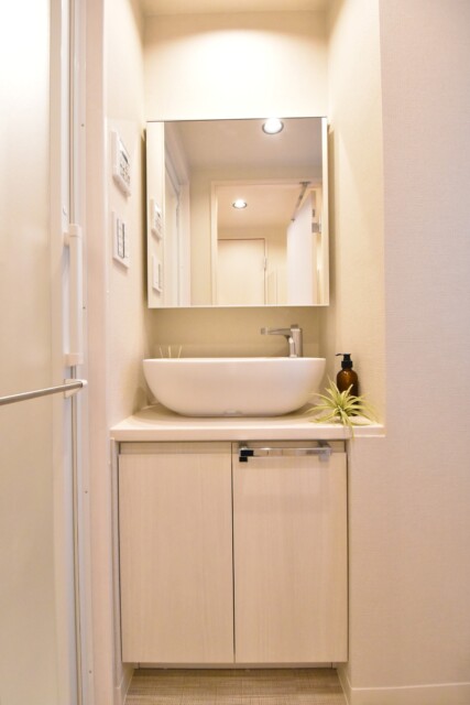 ミラー裏と洗面台下が収納になっていました。洗面ボウルの周りのスペースもいろいろと重宝しそうですね。