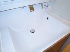 ワイドな洗面ボウルがなんとも魅力的な洗面化粧台。これだけ広いと、水跳ね