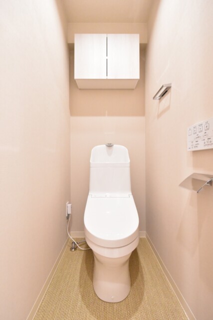トイレはもちろんウォシュレット付。上部には吊戸棚が設置されているので、