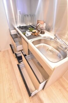 コンロは2口、グリル付き。お魚グリルと呼ばれるように魚以外で使わない方も多いと思いますが、直火での調理はフライパンなどで調理するのとは一味違います。掃除が面倒というのもありますが、肉や野菜など、是非一度試してみてください。その際、換気扇はお忘れなく!