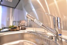 キッチンの水栓は浄水器一体型。蛇口が引き出せるタイプで、シンクのお掃除にも重宝します。