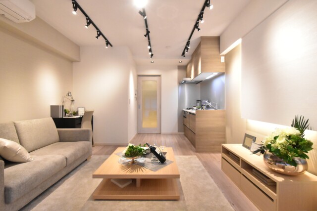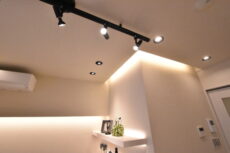 ダウンライト、間接照明、ダクトレールに付けられたスポットライトなど照明にはかなりこだわっています。シンプルな色使いのお部屋に光でアクセントを付けていて、これが高級感の秘密ですかね。