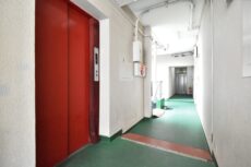 2階にやってきました。なにやらインダストリアルな感じもある外部廊下です。エレベーターの扉の赤と床の緑のコントラストが何ともいえませんね![]()