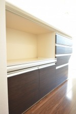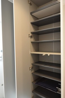 キッチンスペースにはシステムキッチン、カウンターの他に収納棚が2か所とまだまだ収納スペースがあります。すぐ散らかりがちなキッチンスペースですが、これならいつも片付いた状態をキープできそうな予感。