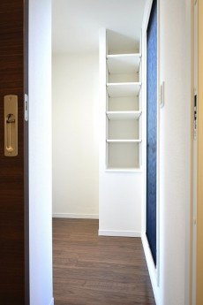 洗濯機置場の横には棚付きの収納スペースが設置されていました。