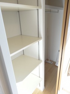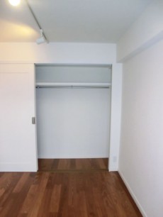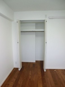 こちらのお部屋にも大型の収納があります。半分は棚、半分はお洋服がかけられる