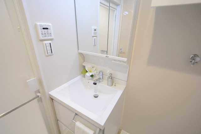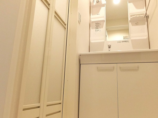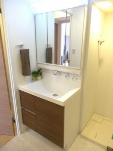 【洗面室:三面鏡付き洗面台・リネン棚】