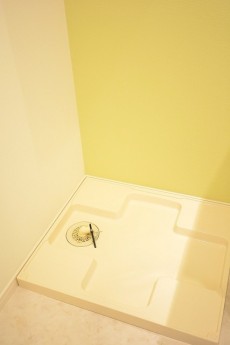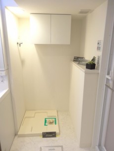 洗濯機置場の上には吊戸棚、横にはカウンターがつくられており、