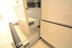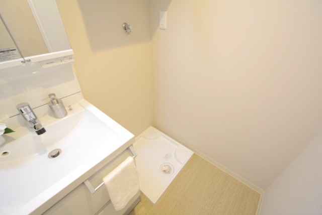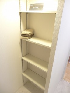 タオルの置場に便利なリネン庫も洗面室内にあります。