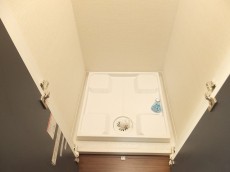 【廊下:ゆったりサイズの収納棚付き洗濯機スペース】