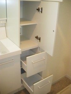 洗面化粧台の脇にはリネン庫。下部が引き出しになっているタイプは珍しいです。