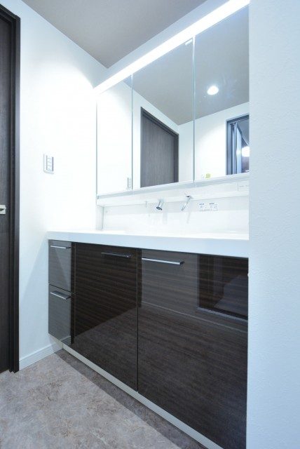 白を基調にダークブラウンの鏡面仕上げの扉の、高級感のある洗面台です。