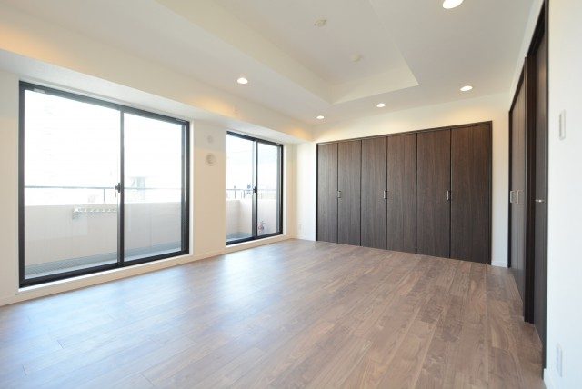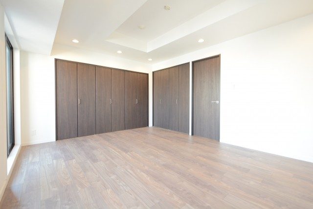リビング並みの広さがありますね。二つ並んだバルコニーに面した南東向きの窓によって明るいお部屋です。