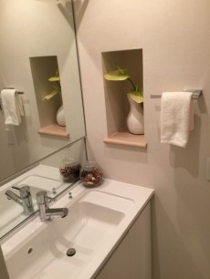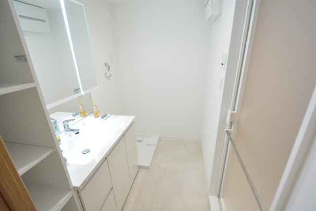 お隣のお部屋に洗面台と洗濯機置場、バスルームがあります。大きな鏡が印象的な洗面台☆左の鏡の裏と下が収納になっているので収納もバッチリです♪シャワーヘッドも嬉しいですね。