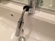水洗はハンドシャワータイプ。洗面ボウルが大きめなので、三面鏡で発見された寝ぐせもこちらで直せますよ(笑)
