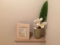 お隣には、三段のガラスの飾り棚があります。お気に入りのインテリアや、お花や観葉植物で自分らしい空間を演出できそうですよ♪