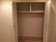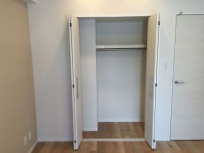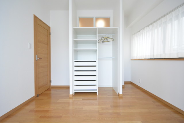 小さい方の窓はL字型。南側はFIX窓で開きませんが、東側は開ける事が出来ます。収納は両側にハンガーポールが付いたウォークインクローゼット。オープンタイプで扉がありませんので風通しが良さそうです。キャリーバッグやスーツケースなど、嵩張る物も入れておける広さがありますよ。