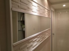 洗面台は身だしなみのチェックに便利な三面鏡付き。鏡の間に付けられた照明のおかげで、鏡を見る時に影になったりする事もありません。