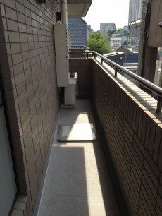 ふたつの内では大きな方のバルコニー。LDKの窓の外もここになります。南向きですが少し奥まっているので、季節や時間によっては陽が入らない時間もありそうです。