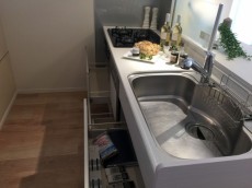 キャビネットはスライド式なのでキッチングッズの収納も楽々(●´∀`●)3つ口コンロはお料理好きの方には嬉しいですね♪シンクは大きめで使い勝手◎