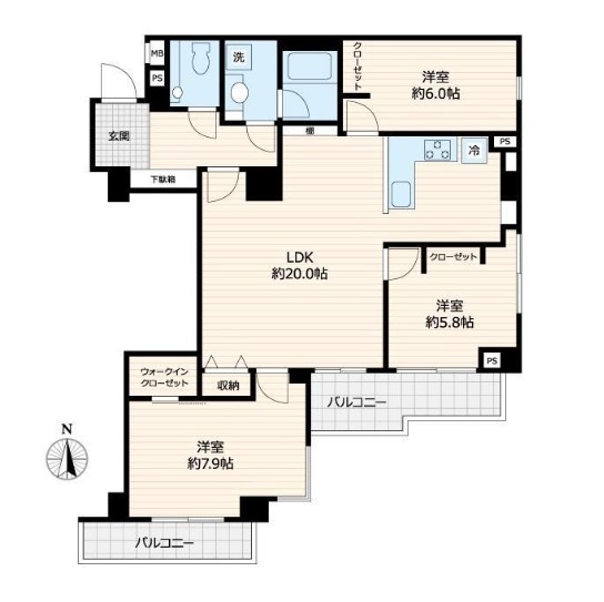 こちらは約7.9帖の洋室。南・東の二面採光のお部屋です。洋室の中では一番大きなお部屋で、大きめのベッドでも二つは置けそう。メインのベッドルームにいかがですか?南向きの大きな窓からはバルコニーにも出られます。