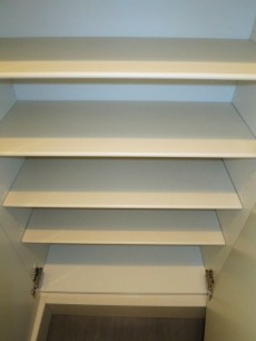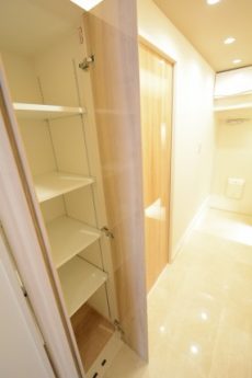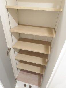 洗面化粧台となりには、棚板が可動式の収納が設けられています。バスタオルや