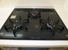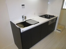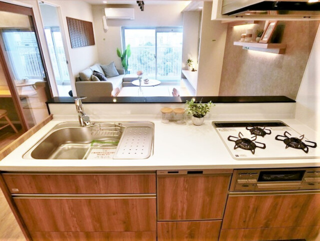 3口のグリル付きガスコンロ、浄水機能付きの水栓、食器洗浄機が付いています。
