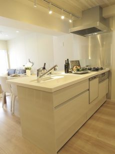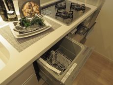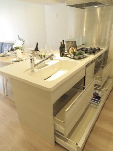 見晴らしが良くお料理中でも会話しやすいのが特徴です。食器洗浄乾燥機や浄水機能一体型水栓など便利機能も充実!!広さがあってしっかりお料理が出来るキッチンです。