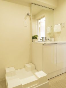 洗面室には洗面台の他に、洗濯機スペース、浴室、物入、トイレがまとまっていて、脱衣所も兼ねています。脱いですぐ洗濯出来れば便利ですね。白一色の清潔感のある洗面台はキャビネット付き。細々した物が多くなりがちな洗面廻りに収納が多いのは助かります。